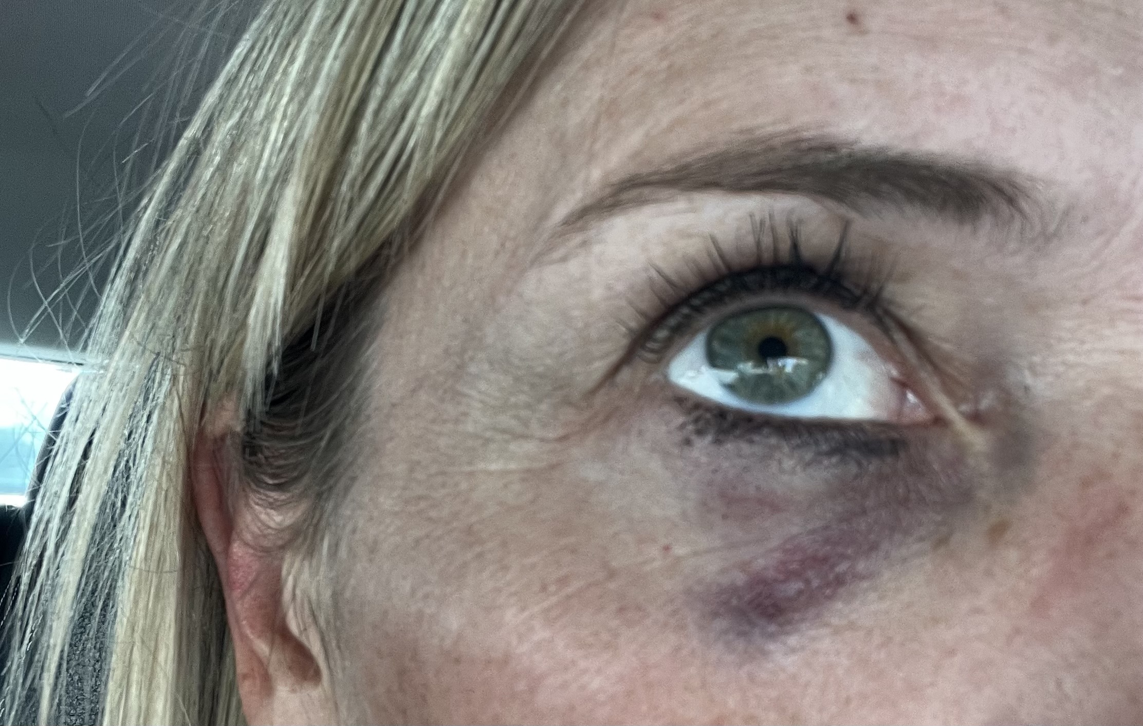 A 42-year-old woman experiences an attack conflict in the eye area after receiving a threatening email from her boss. During the CA phase (5 days), unnoticed cell proliferation occurs in the sclera and as a protective reaction. After conflict resolution (boss reassures her), the PCL phase begins: inflammatory breakdown of cells, minor vessel ruptures → bruise under the eye (black eye), swelling, and color changes until full recovery. Biological purpose: temporary protection of the eyes during the “danger period.”
